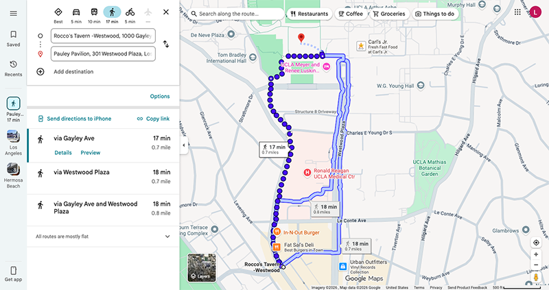 If you park at the stadium, you can get on Gayley Ave for a .7 mile walk to Rocco’s.